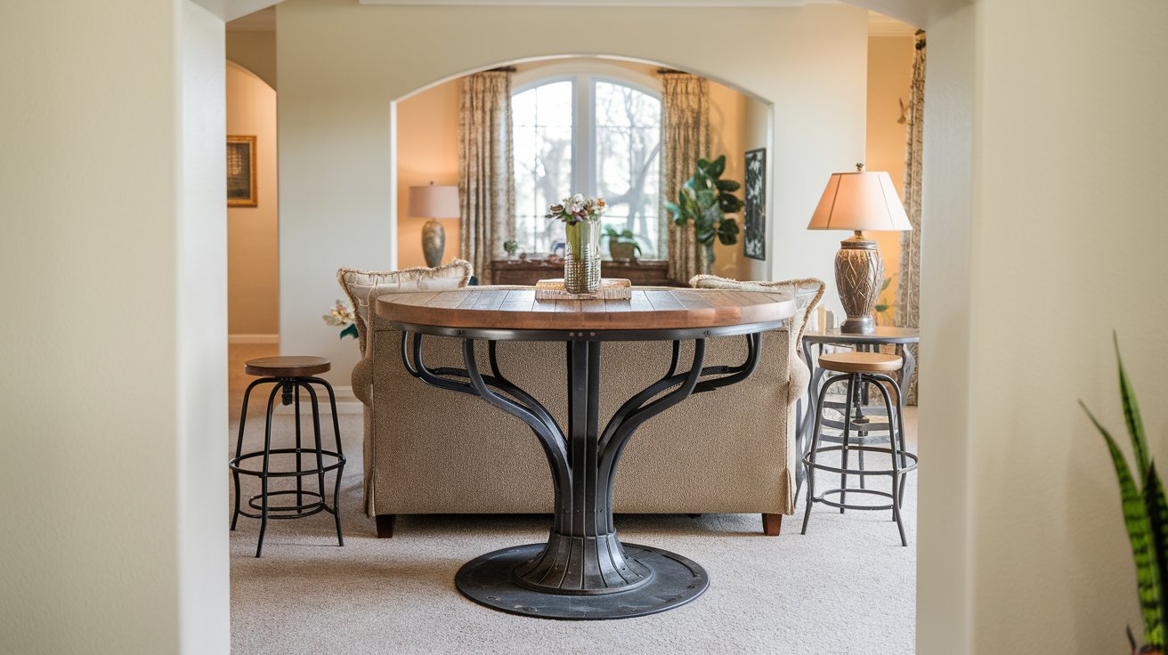 Consider your sofa’s back height when selecting furniture. The bar table should be 8-12 inches taller than your sofa back for proper proportions. Standard sofas measure 28-36 inches from floor to top of backrest, making 40-42 inch bar tables the perfect complement for most living room setups in 2025.